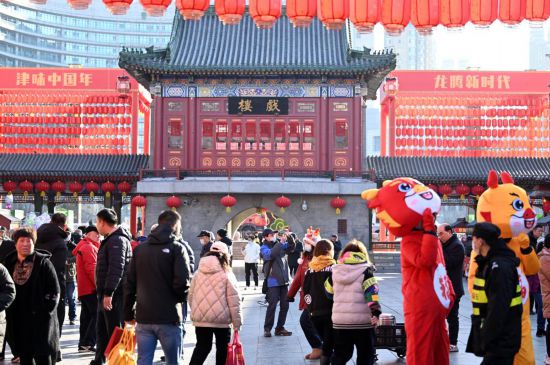 春节期间,天津最早的民俗、文化、商贸聚集地古文化街披上了节日盛装,到处点缀着喜气洋洋的“中国红”。街上桂发祥十八街麻花、杨柳青年画、果仁张等中华老字号、国家非物质文化遗产商家林立,吸引着八方来客在前来游览“打卡”。